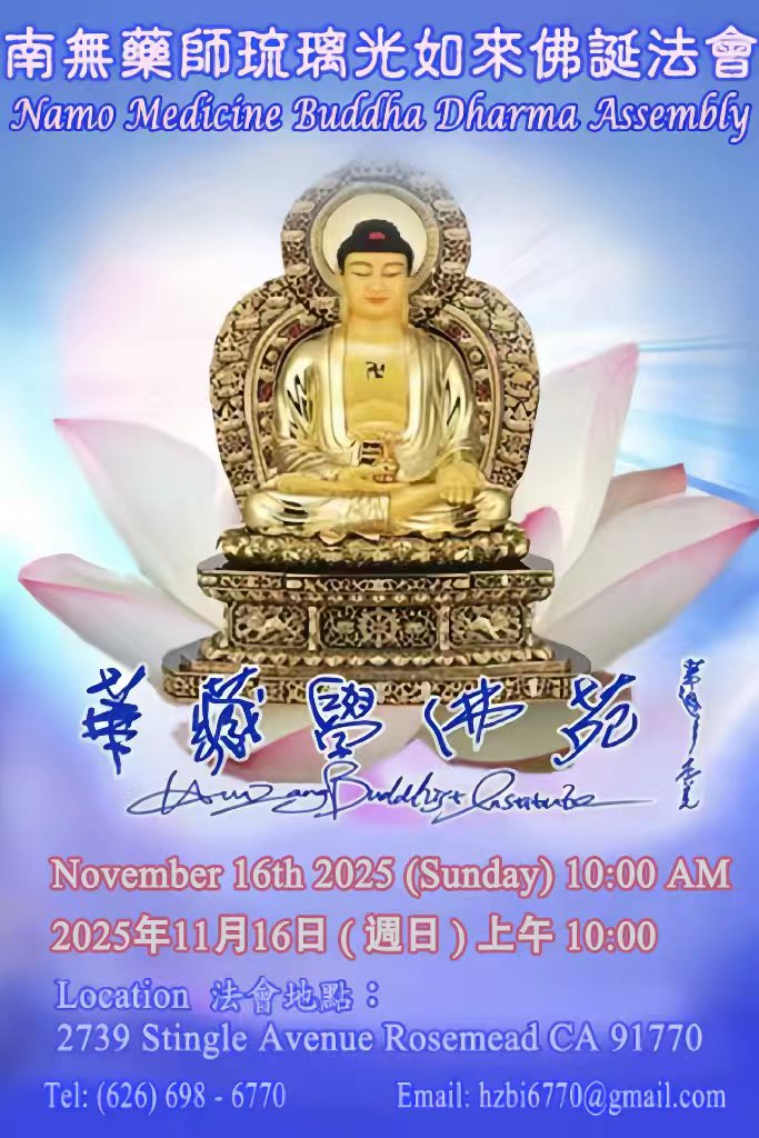 為恭賀 南無藥師瑠璃光如來佛誕,美國洛杉磯華藏學佛苑(Hua Zang Buddhist Institute ) 將於2025年11月16日(星期日)上午10:00啟建《消災延壽 南無藥師佛佛誕法會》。屆時將誦經、祈福消災,並於七尊 南無藥師佛像前連續七天供奉消災延壽琉璃燈及設供佛吉祥蓮花燈,為眾生祈福增慧,減少災病,遠離業障,一切吉祥。歡迎十方信眾踴躍參與,共霑法益。