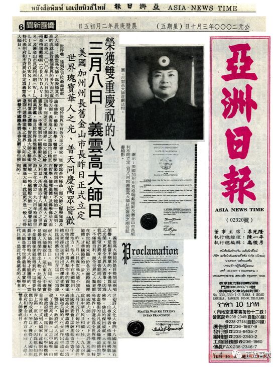 世界唯一达到全方位最高成就之大师—义云高大师,为表扬其至高的成就及对整个世界的多方面之贡献,于西元二OOO年三月八日加州州长格瑞戴维斯(GRAYDAVIS)及旧金山市长威利布朗(WILLIE L,BROWN,JR)。特代表州府和市府将此日定为义云高大师日。