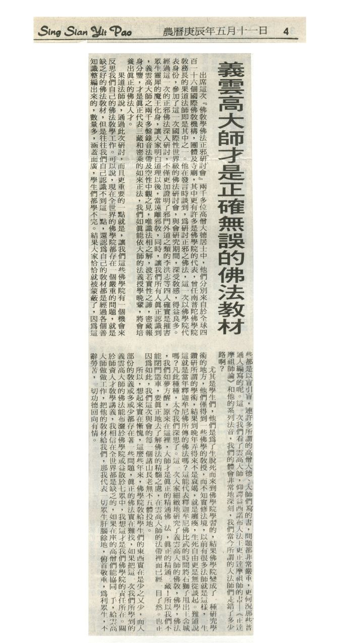 出席这次「佛教佛学佛法正邪研讨会」两千多位高僧大德居士中,他们分别来自于全球四百一十六个国际佛教机构,团体及寺庙,其中更有许多是佛学院的代表,曾任南普陀佛学苑教务长的果道法师即是其中之一。他在发言时谈到,为研讨正邪之佛法,这一次以佛学院代表身份,参加了这一次国际性世界级的佛法研讨会,与会研究期间,得益良多。经过这一次的正邪佛法深入研讨,不仅更加证明了邪门外道之类的李洪志等四人确实是摧害众生灵犀的魔王化身,让大家明白道理以后,当远离邪教,同时,让我们所有人真正认识到,义云高大师之两千多盘录音法带及空性中观之见,唯识法相之解,般若实性之谛,密藏报身分鉴,才是真正代表三藏和密乘的如来正法,我们如能依大师的法义授学晚辈,将会培养出真正的佛法人才。