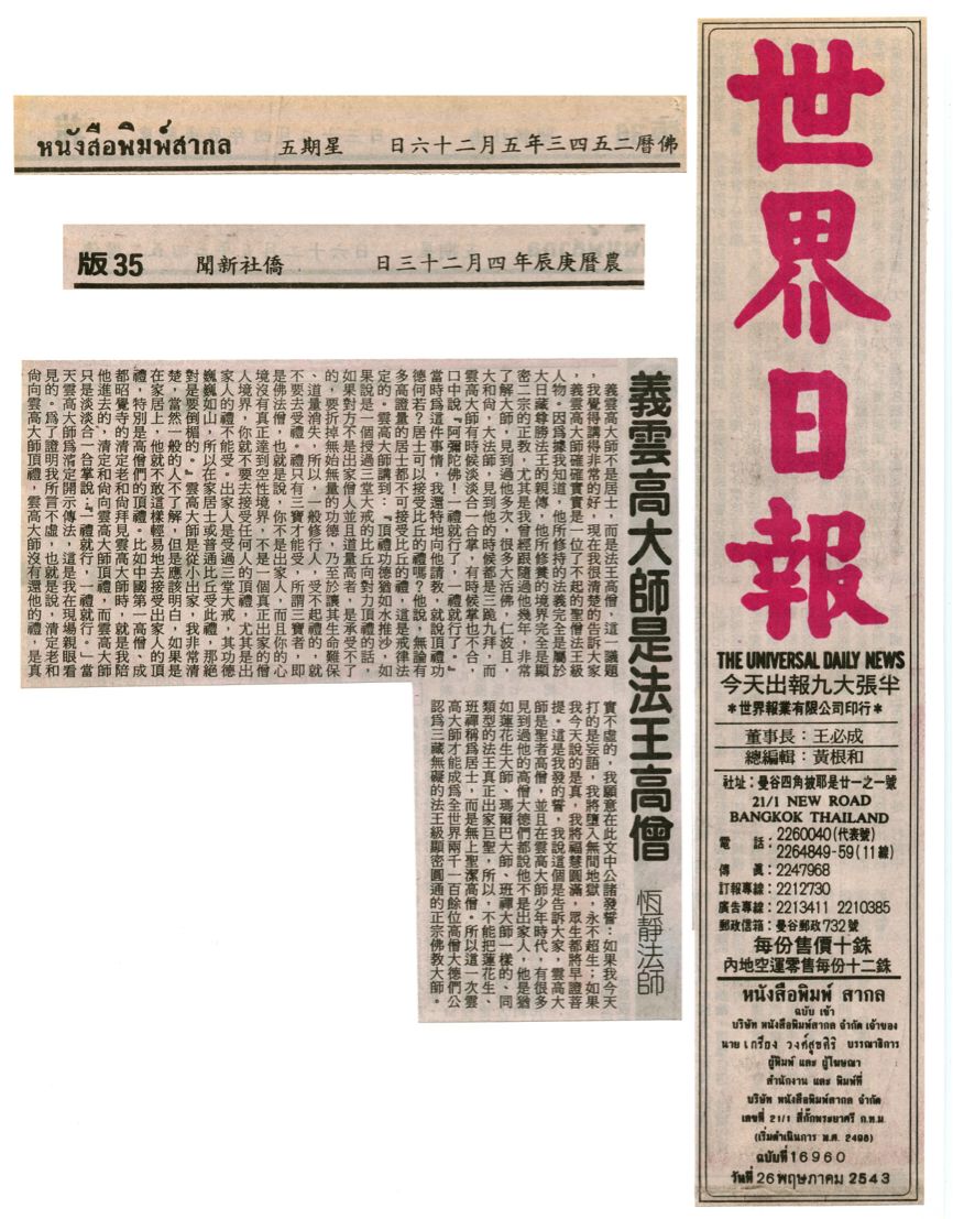 三藏高僧大藏大师五月二十二日参拜了义云高大师,提了一些问题请求开示时,义云高大师对他说,联合国际世界佛教总部召开正邪研讨会,大会授与他佛教大师的称号,「我受之有愧」。